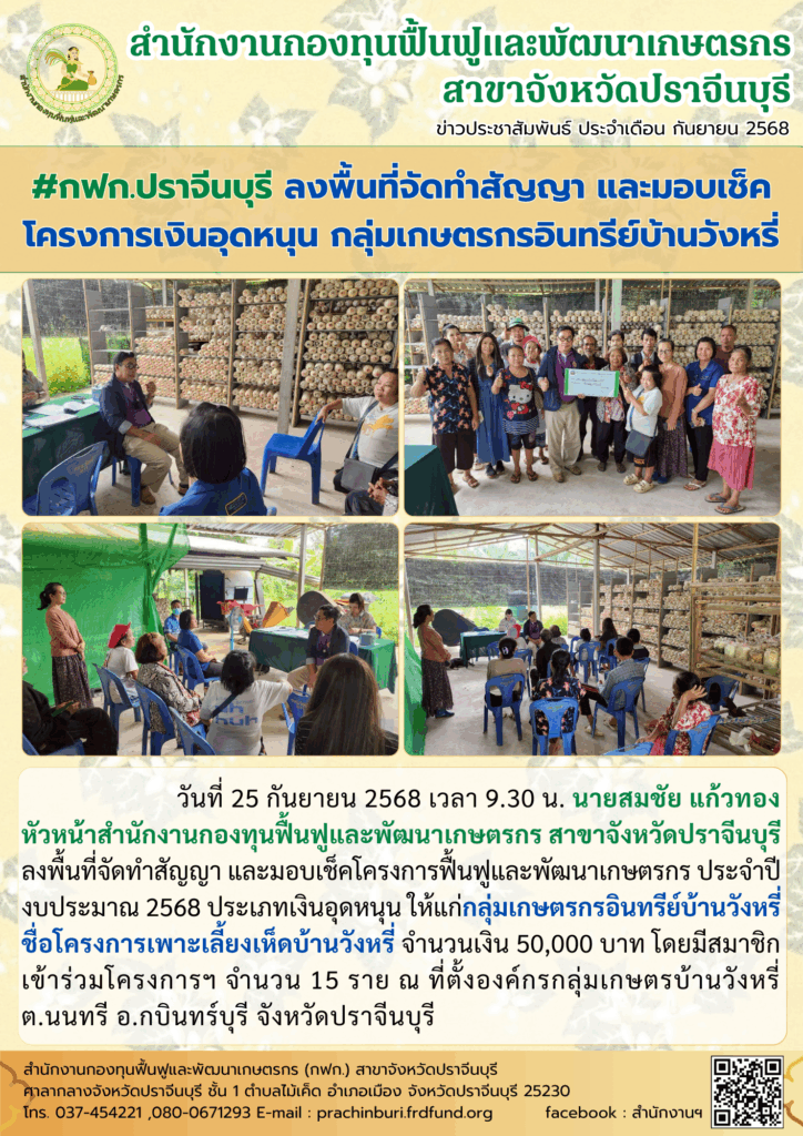 วันที่ 25 กันยายน 2568 เวลา 9.30 น. นายสมชัย แก้วทอง หัวหน้าสำนักงานกองทุนฟื้นฟูและพัฒนาเกษตรกร สาขาจังหวัดปราจีนบุรี ลงพื้นที่จัดทำสัญญา และมอบเช็คโครงการฟื้นฟูและพัฒนาเกษตรกร ประจำปี งบประมาณ 2568 ประเภทเงินอุดหนุน ให้แก่กลุ่มเกษตรกรอินทรีย์บ้านวังหรี่ ชื่อโครงการเพาะเลี้ยงเห็ดบ้านวังหรี่ จำนวนเงิน 50,000 บาท โดยมีสมาชิกเข้าร่วมโครงการฯ จำนวน 15 ราย ณ ที่ตั้งองค์กรกลุ่มเกษตรบ้านวังหรี่ ต.นนทรี อ.กบินทร์บุรี จังหวัดปราจีนบุรี