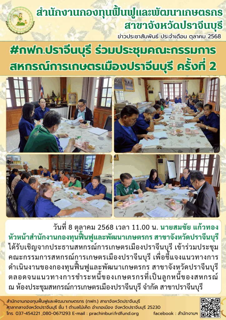 วันที่ 8 ตุลาคม 2568 เวลา 11.00 น. นายสมชัย แก้วทองหัวหน้าสำนักงานกองทุนฟื้นฟูและพัฒนาเกษตรกร สาขาจังหวัดปราจีนบุรี ได้รับเชิญจากประธานสหกรณ์การเกษตรเมืองปราจีนบุรี เข้าร่วมประชุมคณะกรรมการสหกรณ์การเกษตรเมืองปราจีนบุรี เพื่อชี้แจงแนวทางการดำเนินงานของกองทุนฟื้นฟูและพัฒนาเกษตรกร สาขาจังหวัดปราจีนบุรีตลอดจนแนวทางการชำระหนี้ของเกษตรกรที่เป็นลูกหนี้ของสหกรณ์ ณ ห้องประชุมสหกรณ์การเกษตรเมืองปราจีนบุรี จำกัด สาขาปราจีนบุรี